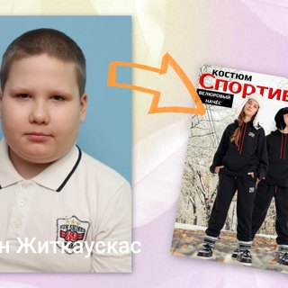 А Леону Житкаускасу уже 11 лет, учится в 5 классе. Воспитывается в многодетной семье: две девочки и три мальчика. Работает только папа. Леон самый старший в семье. Добрый мальчик, старается учиться, помогает маме. Леон мечтает о спортивном костюме. Рост у мальчика 148, обхват бёдер 99 см, обхват груди 94см. Размер костюма 176.