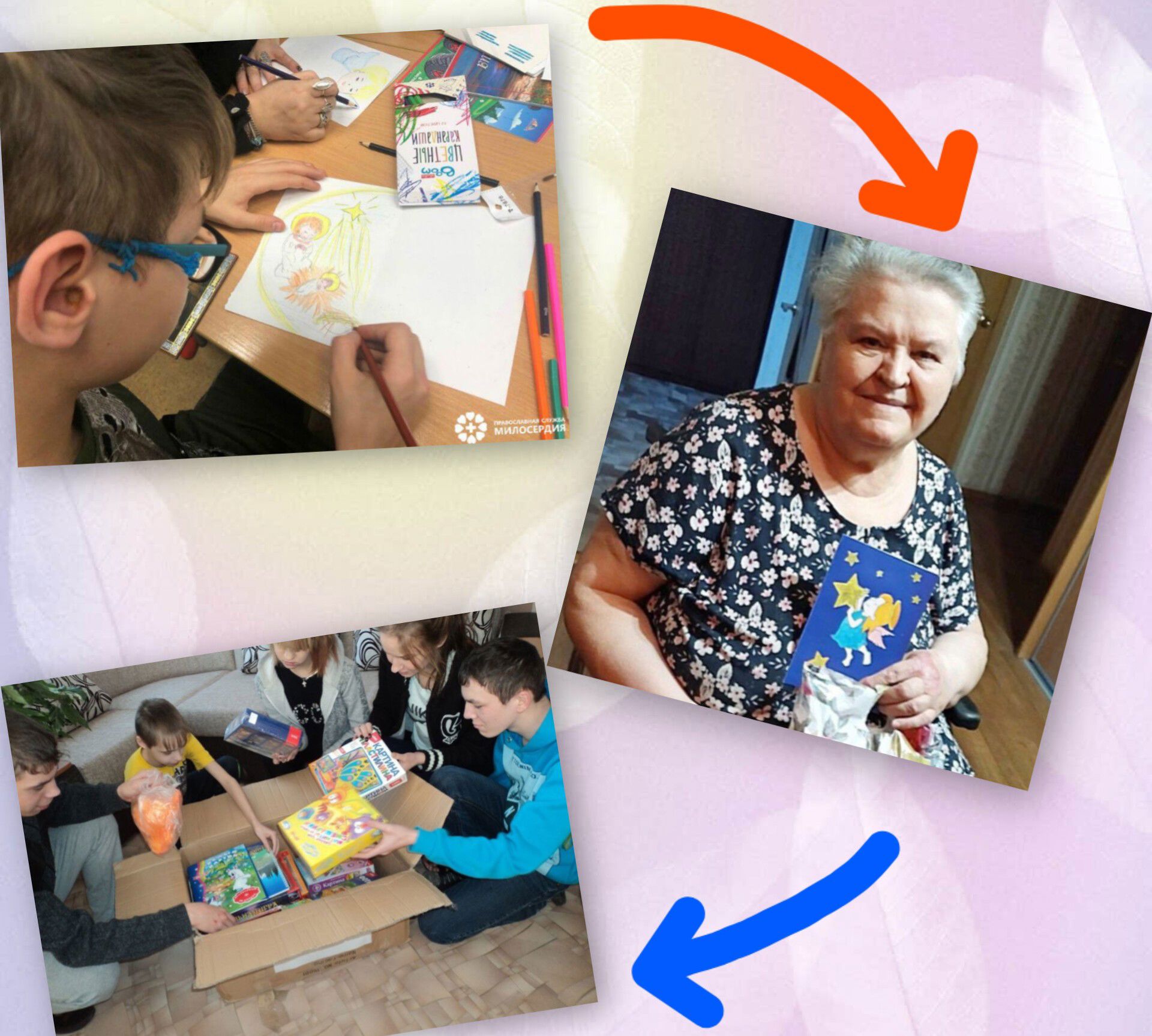 В течение декабря добровольцы и сестры милосердия проводят для ребят мастер-классы, рассказывая о сути праздника Рождества Христова. А ребята, в свою очередь, рисуют (или изготавливают в любой другой технике) рождественские открытки, в которых благодарят Бога за события прошедшего года и вкладывают особые пожелания «для неизвестного друга». Этим неизвестным получателем становятся подопечные патронажной службы, пожилые и одинокие люди с инвалидностью, для которых детская открытка – утешение и радость. Открытки вручаются подопечным на Святках. И в это же время добровольцы приезжают к ребятам, чтобы поблагодарит их за участие в празднике.