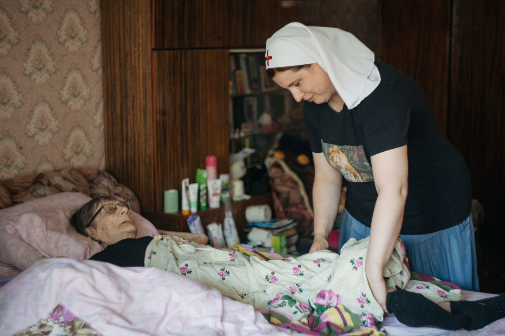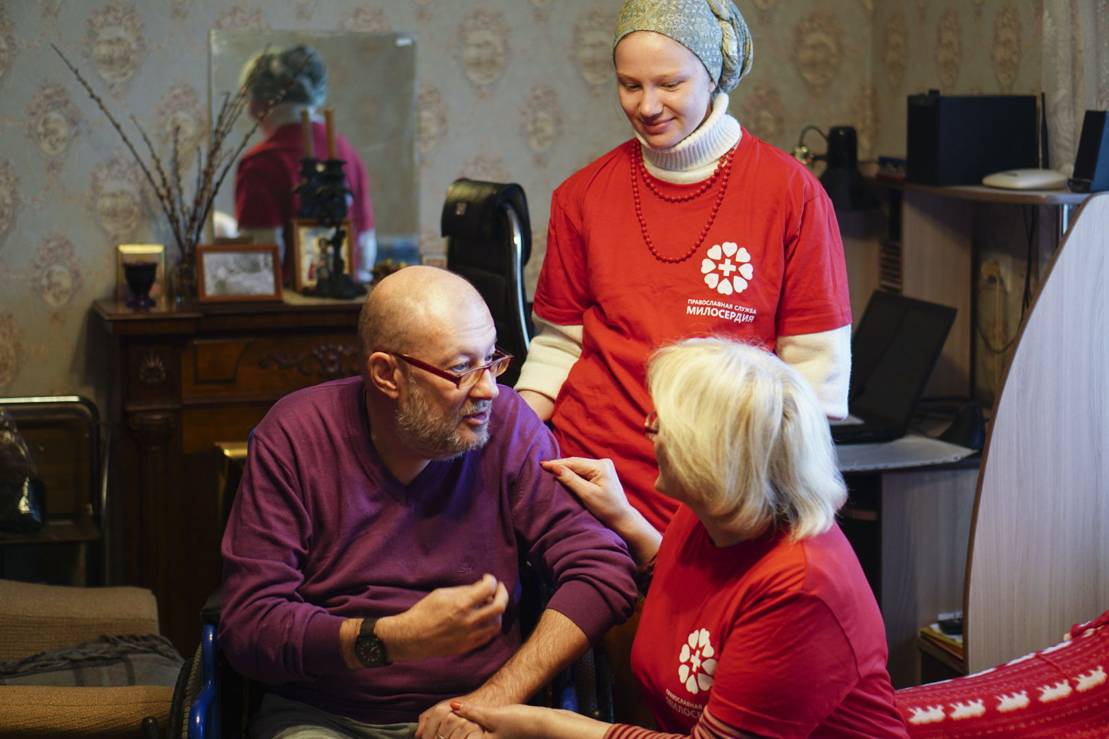 Уход за подопечными в тяжелом состоянии осуществляется силами сестер милосердия, добровольцы организуются на несложный уход и бытовую помощь. По желанию подопечного на дом приезжает священник для совершения Таинств Исповеди и Причастия, Соборования. Специально подготовленные сестры милосердия (катехизаторы) помогают в изучении православной веры и подготовки к таинствам.