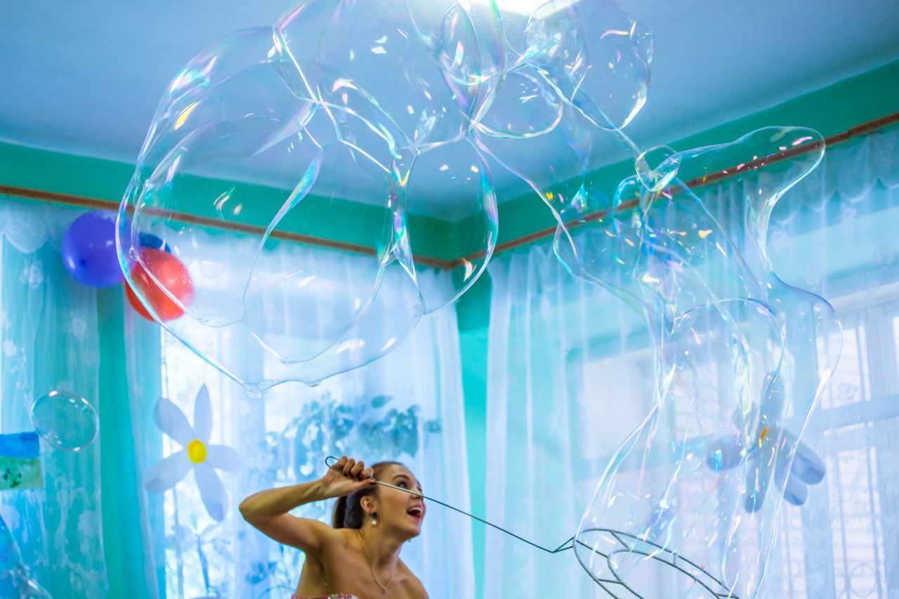 Кульминацией мероприятия стало профессиональное шоу мыльных пузырей. Все-все-все малыши и даже некоторые взрослые не смогли усидеть на месте и поднялись со стульев. В общем, и правильно, ведь усидеть, когда такая красота рядом летает, просто невозможно. В полном восторге, повизгивая и размахивая руками, наши маленькие зрители смотрели как мыльные пузыри превращаются то в гигантскую сосиску, то в целый городок пузыриков внутри переливающегося как радуга гигантского пузыря. И все это под энергичную музыку и забавные комментарии.